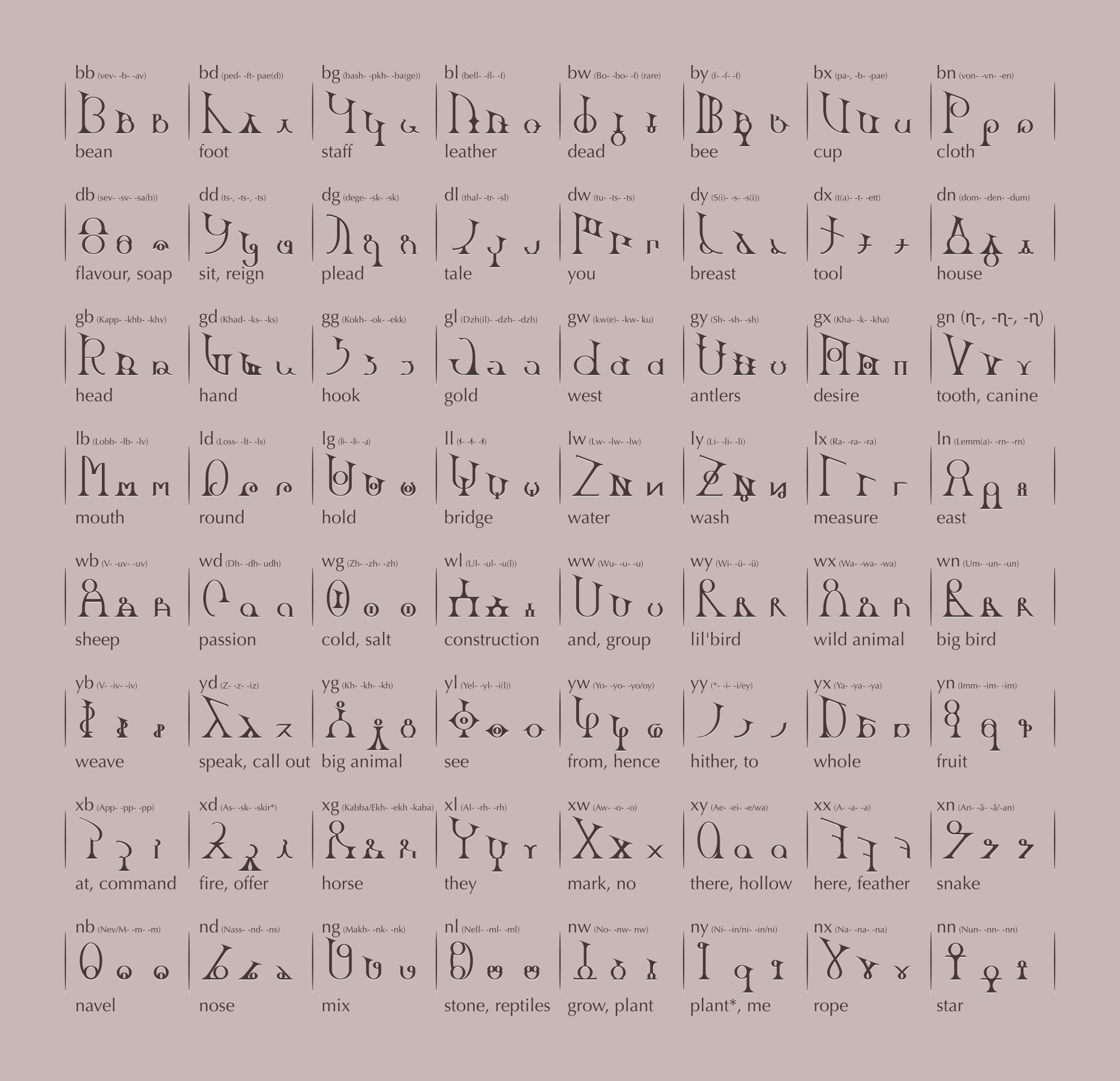 | Alone | Kappa | Khad | Koh | Dzhil | Go | Shela(kh) | Kah | Tshan |